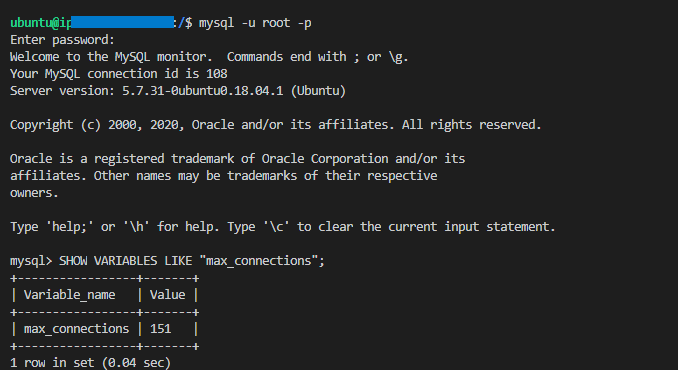 The MySQL connections limit can be found in a variable called “max_connections,” which is 151 by default. You can check this value by connecting to the MySQL instance and executing the following database query: SHOW VARIABLES LIKE "max_connections";