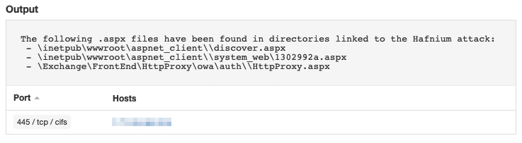 The IOC plugin will flag files in select Exchange Server directories where attackers are known to have implanted webshells. These details can be seen in the output section of the scan results:
