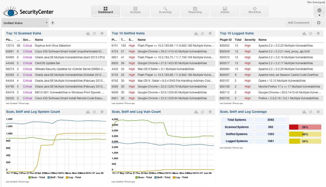 Below is an example SecurityCenter dashboard that summarizes the vulnerabilities found from Nessus scans, sniffed vulnerabilities via the Passive Vulnerability Scanner and logged vulnerabilities via Log Correlation Engine.